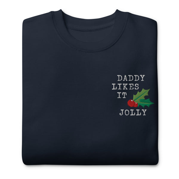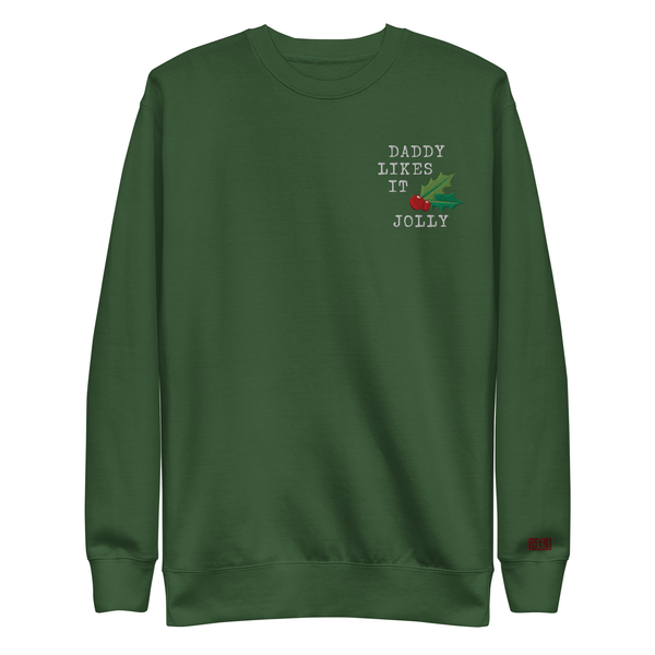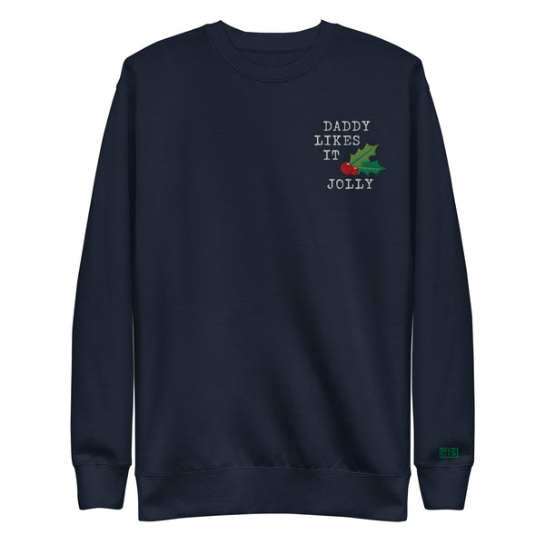 Daddy Likes It Jolly with holly leaf & berry graphic embroidered on the left chest. Cody Tries Stuff monogram logo embroidered on the left wrist.